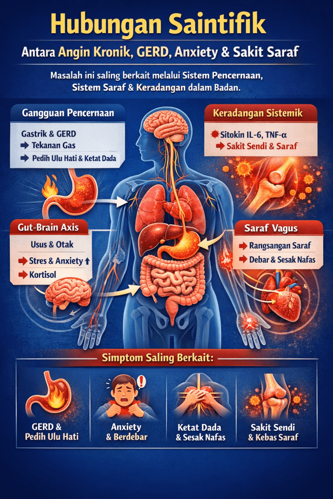 Ramai orang tak sedar sebenarnya masalah angin kronik, GERD, gastrik, anxiety, ketat dada, sakit sendi dan saraf sering berkait antara satu sama lain.